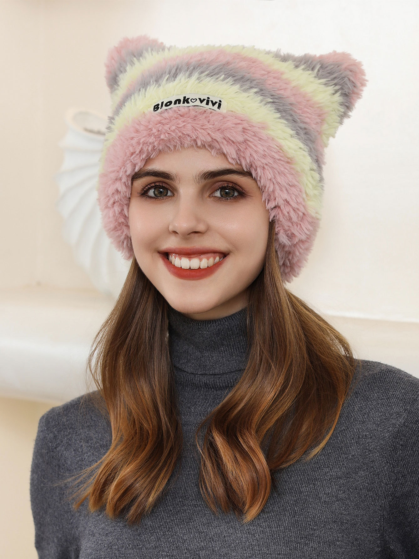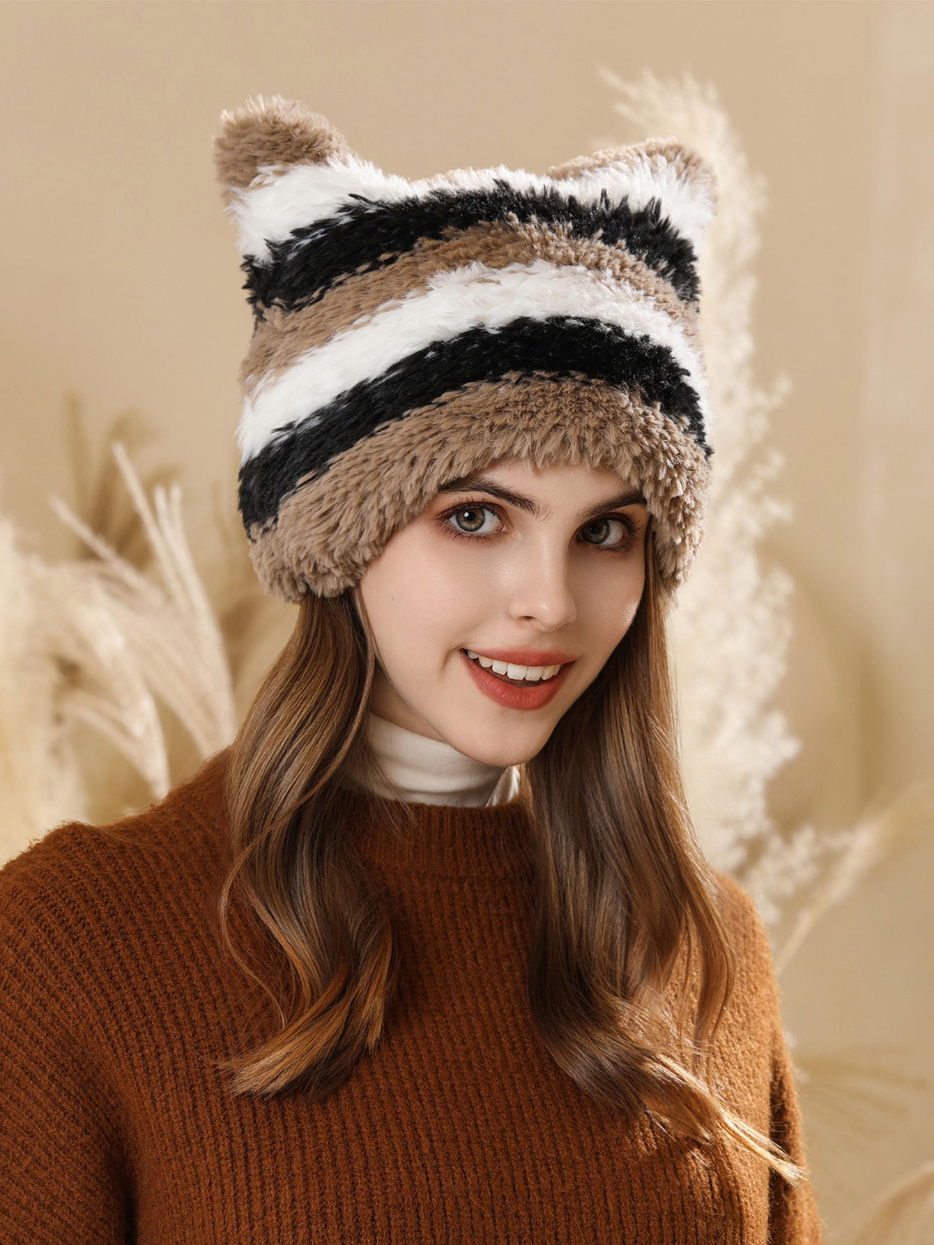 Chapeau chaud rayé avec oreilles de chat mignon, cache-oreilles en laine pelucheuse, petit bonnet épais pour le visage