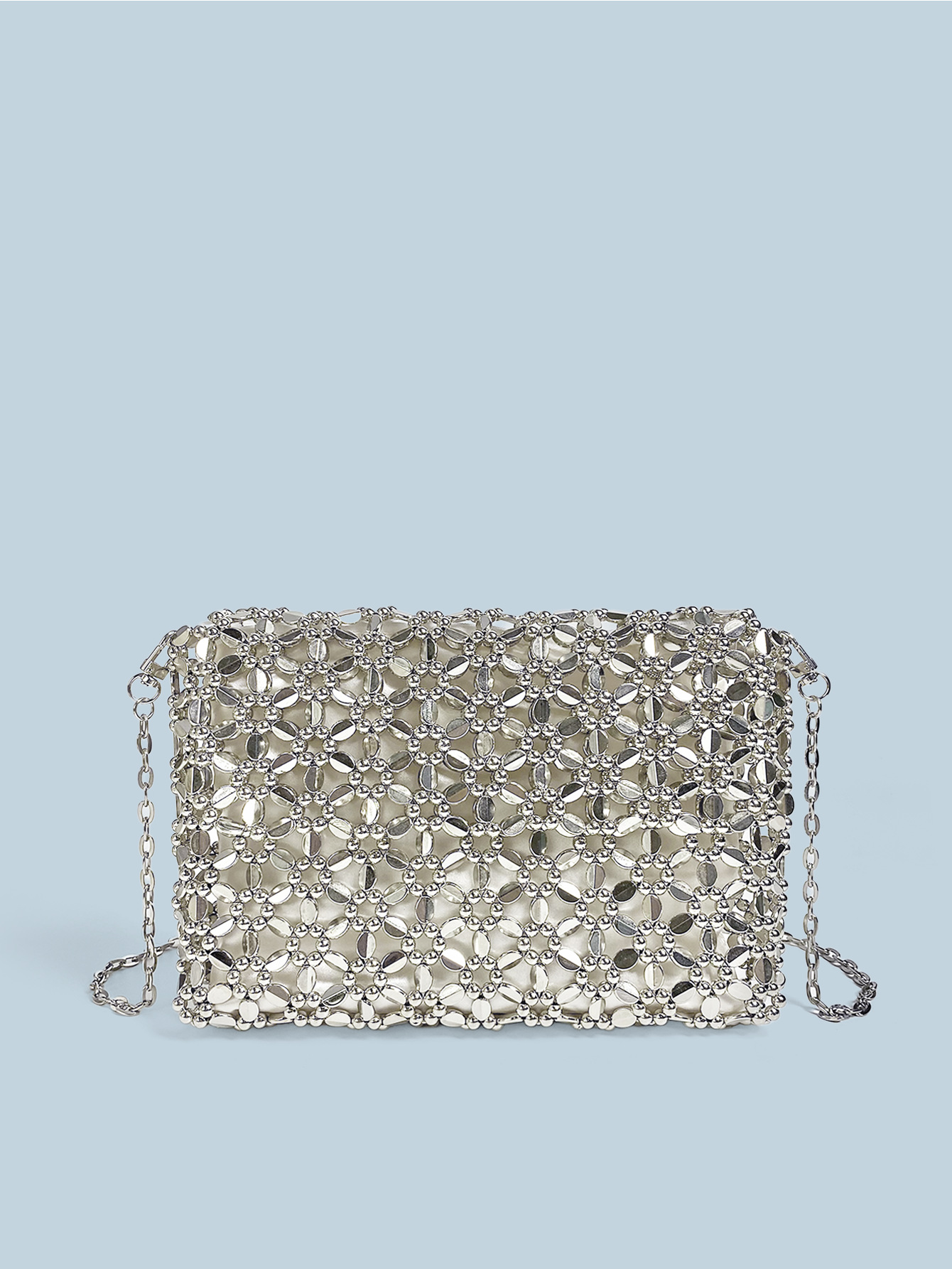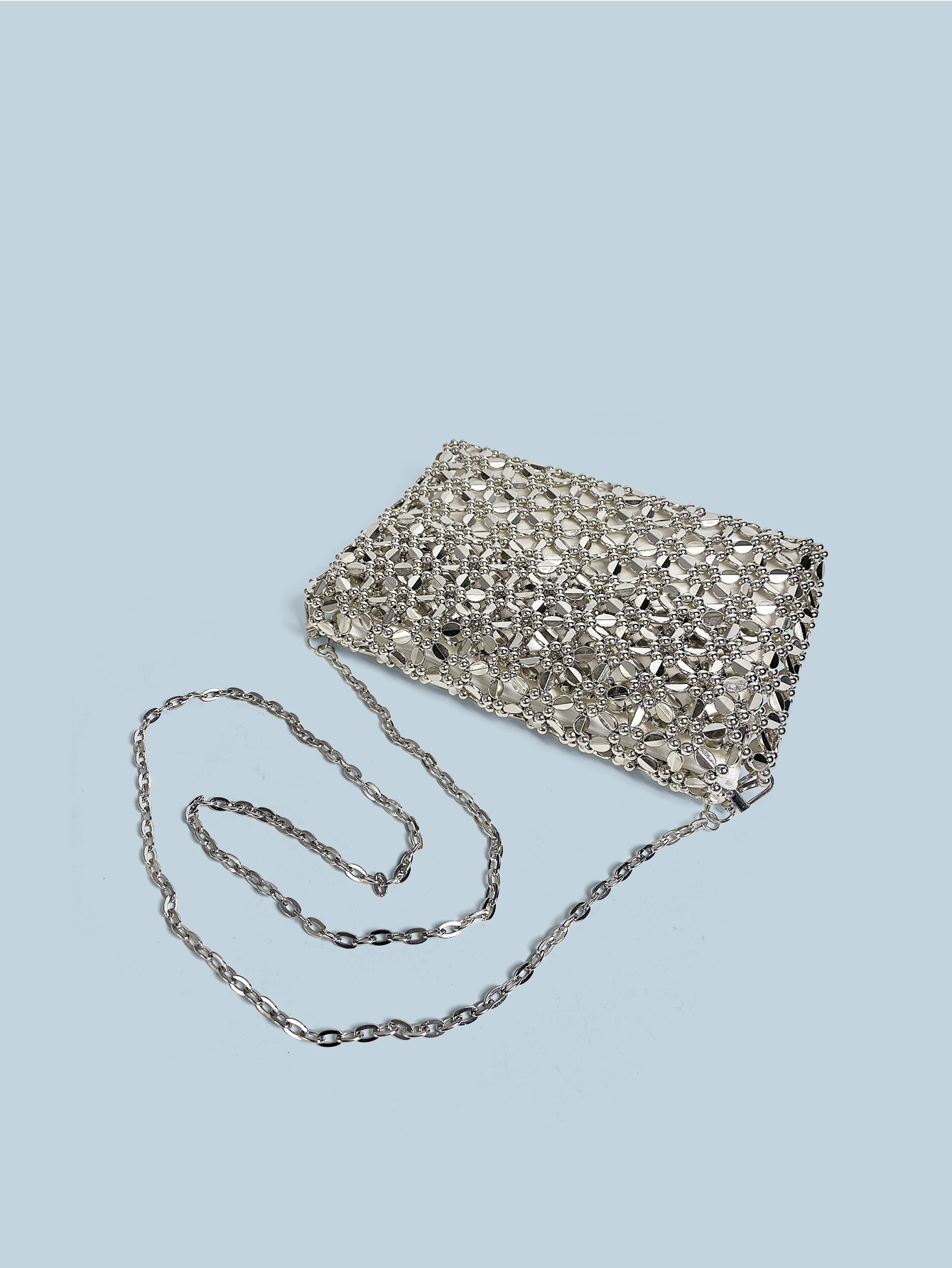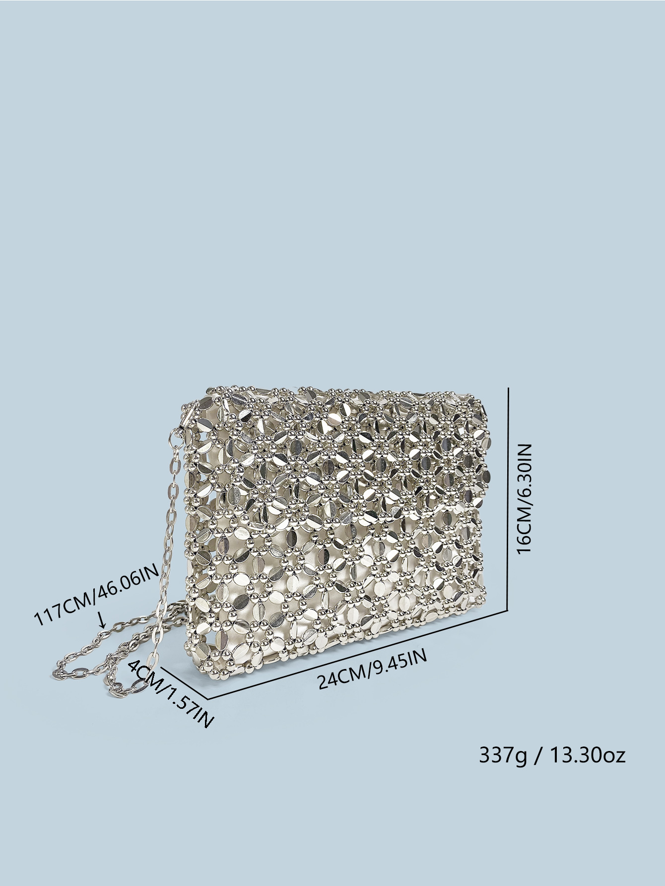 Petit sac carré en perles tissées à la main argentées brillantes avec perles de cocktail creuses à bandoulière