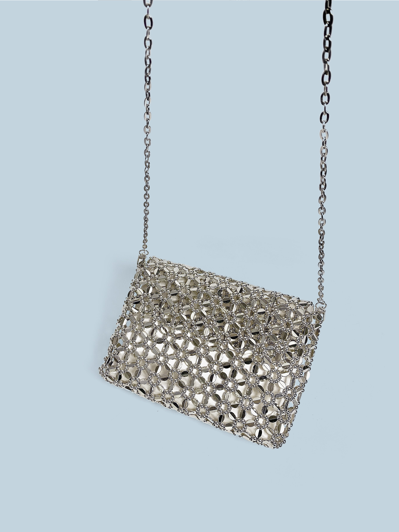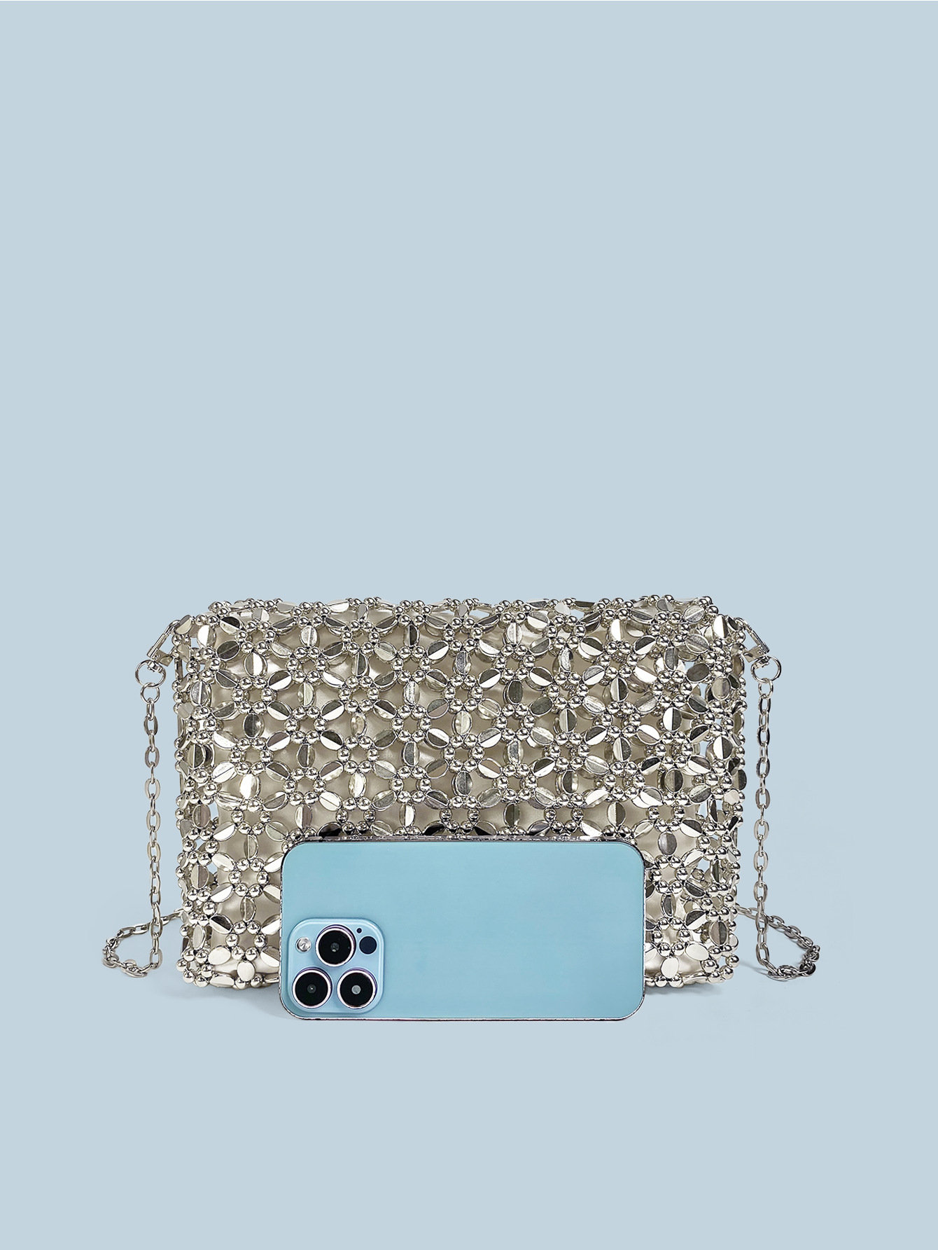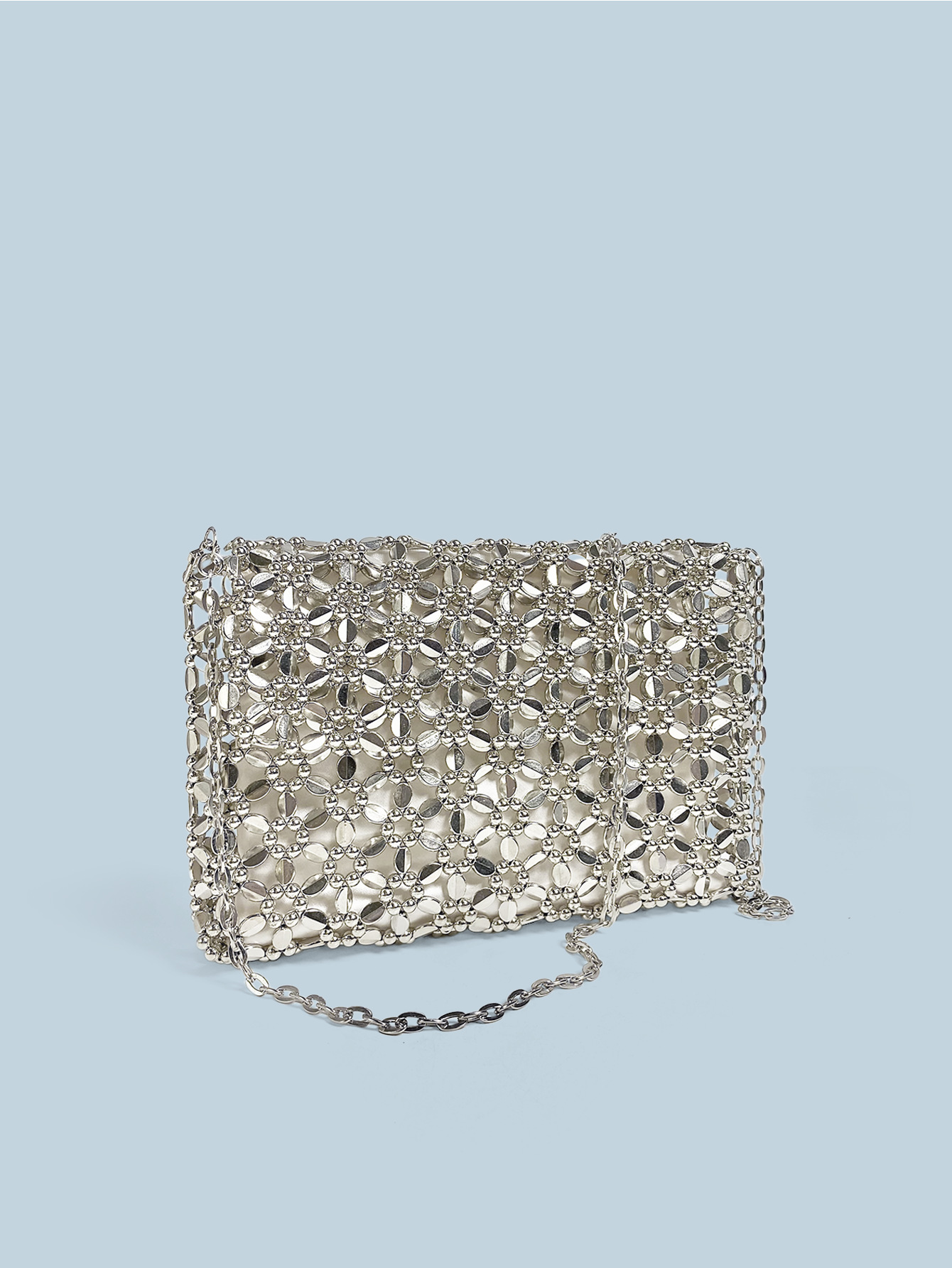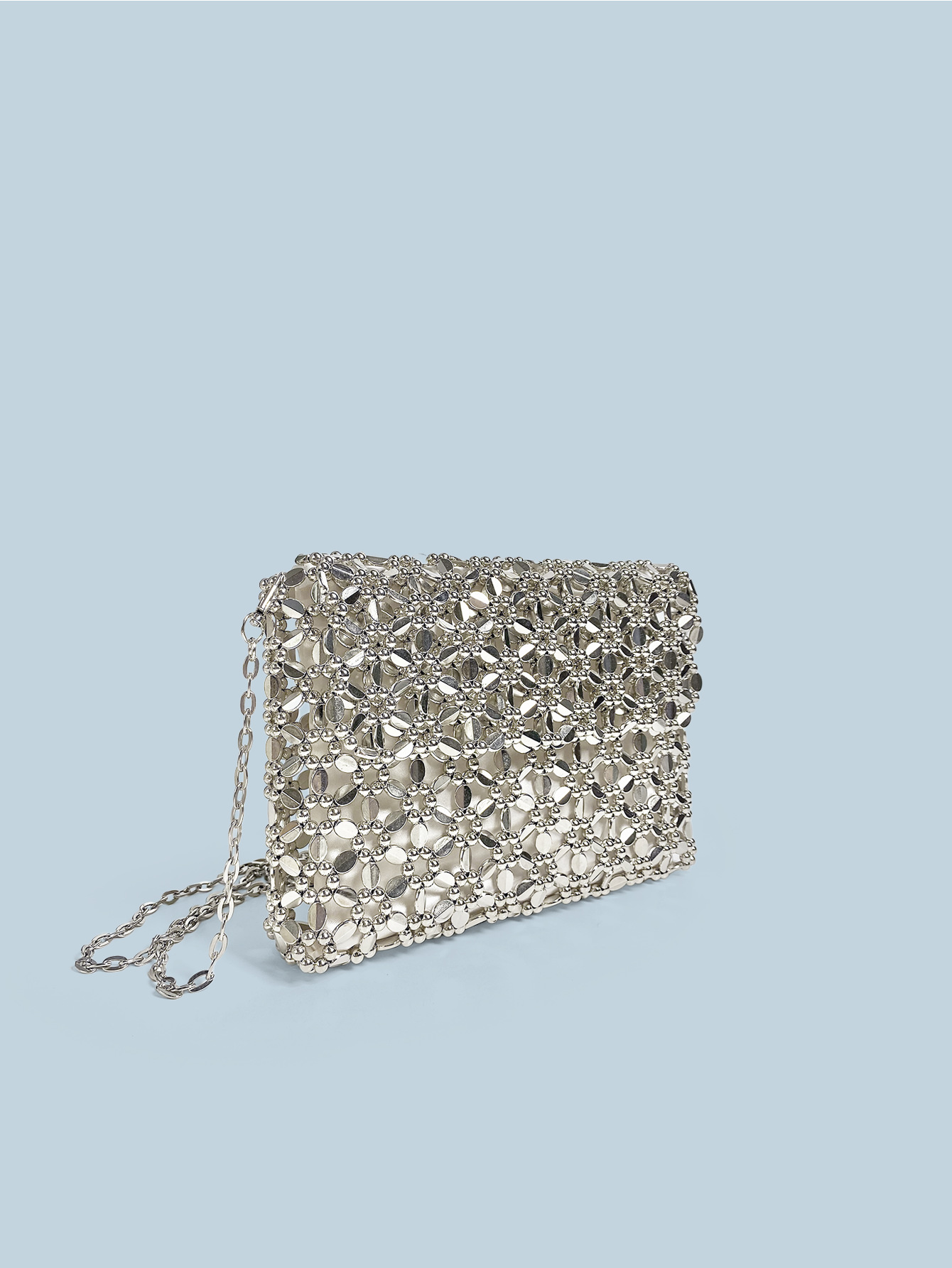 Petit sac carré en perles tissées à la main argentées brillantes avec perles de cocktail creuses à bandoulière